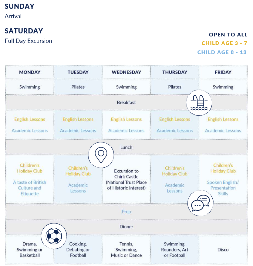 コースは 3〜13歳のお子様と保護者 を対象としており、親子同室の 専用バスルーム付き宿泊施設、週に複数回の遠足、朝・昼・夕食を提供するダイニングホール、保護者専用フィットネススイートを備えた最新のスポーツホール、ショッピングセンター、ヘルスセンター、温水プール、劇場、そして「マンデー・コーヒーモーニング」などが用意されています。