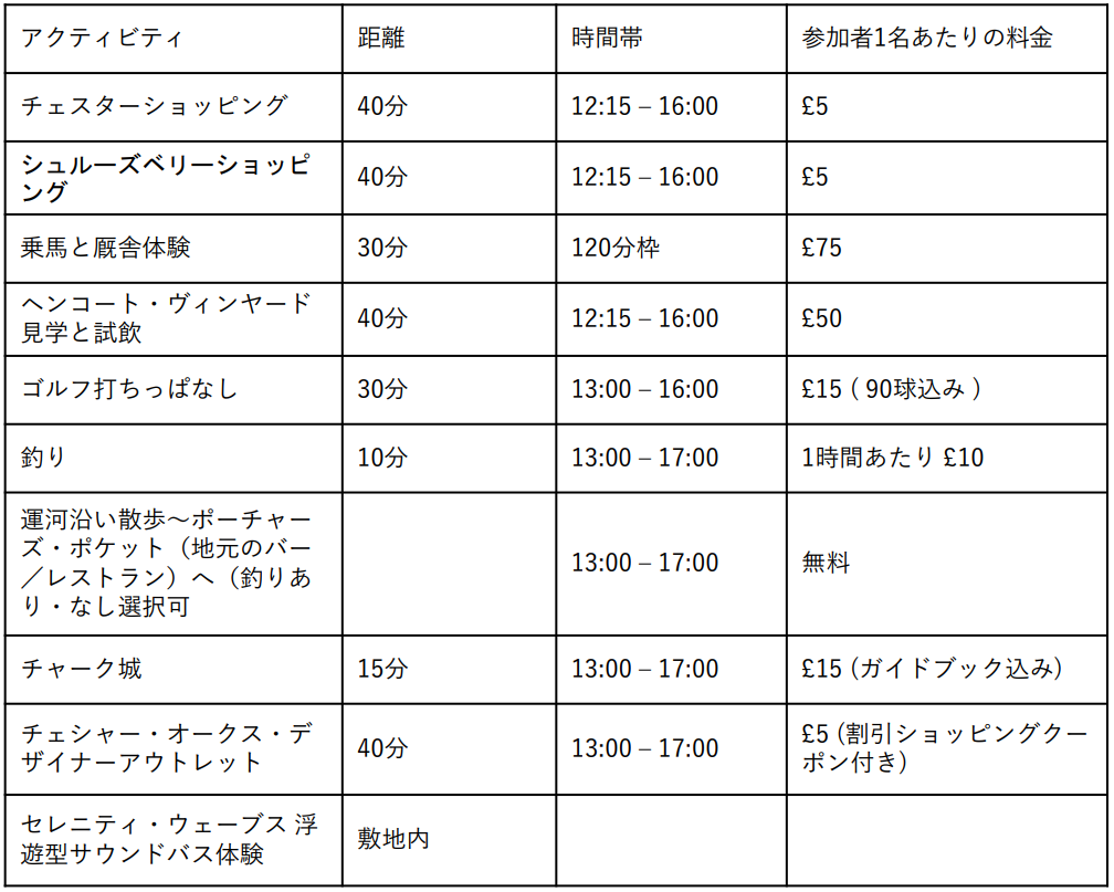 | 空港送迎 | 空港や駅からの送迎は別料金で手配可能。距離に応じて料金が発生します。最寄りの空港であるマンチェスター空港とリバプール空港からの送迎は £165、バーミンガム空港からは £210 、ヒースロー空港からは£380 |